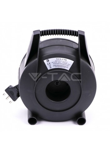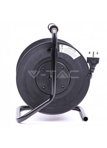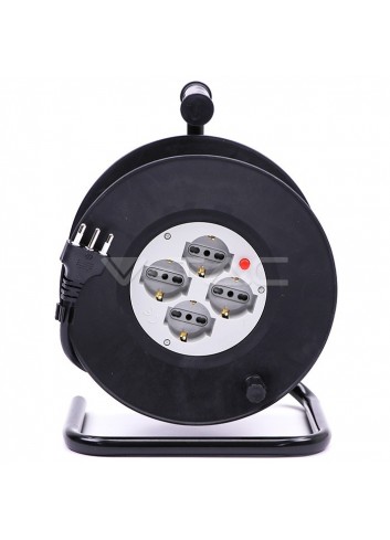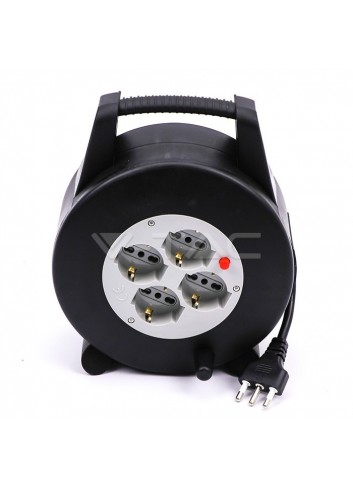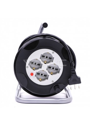 V-Tac Prolunga avvolgicavo di colore nero con spina e 4 prese bivalenti/Schuko. Il cavo, ha spina del tipo 2P+T 16 e 4 prese del tipo 2P+T 10/16A bivalenti + Schuko con fili di sezione 1,5mm². Carico massimo di 2200W - 250V. Lunghezza cavo 25 metri. SKU 8703.