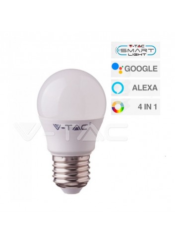 V-Tac VT-5124 Lampadina LED Smart RGB+W 4in1 dimmerabile con potenza di 4,5W e attacco E27. Forma MiniGlobo G45 in materiale termoplastico bianco. Compatibile anche con i sistemi Amazon Alexa e Google Assistant Flusso luminoso 300lm. SKU 2755.