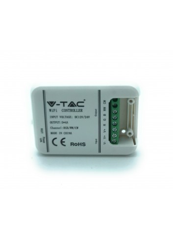 Controller V-tac Smart VT-5009 (SKU 8426) per Strisce LED con connessione Wi-Fi. Con questo controller dimmer, è possibile regolare l'intensità luminosa, l'accensione e lo spegnimento di strisce LED RGB o monocolore. Voltaggio di entrata: DC 12-24V. Potenza di uscita: 12V 120W, 24V 240W (<4A per canale).