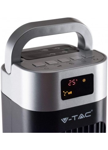V-Tac tower fan VT-5546 con potenza di 55W, con display digitale e telecomando. Il display digitale mostra la temperatura dell'ambiente e grazie ai tasti posti nella parte superiore è possibile accedere alle sue funzioni. Controllabile anche grazie al telecomando compreso. SKU 7901.
