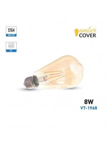 Lampadina LED V-Tac VT-1968 con potenza di 8W e attacco E27. Forma Bulb ST64 in vetro trasparente ambrato. Flusso luminoso 700lm. 1 temperatura di colore: Luce Calda 2200K SKU 4421.