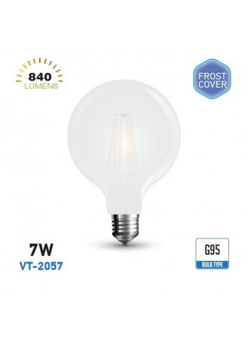 Lampadina LED V-Tac VT-2057 con potenza di 7W e attacco E27. Forma Globo G95 in vetro satinato. Flusso luminoso 840lm. 2 temperature di colore: Luce Calda 2700K SKU 7187 e Fredda 6400K SKU 7188.