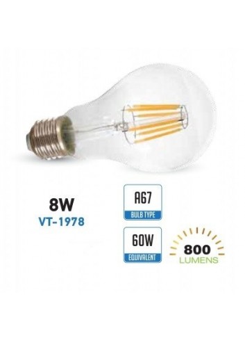 Lampadina LED V-Tac VT-1978 con potenza di 8W e attacco E27. Forma Bulb A67 in vetro trasparente. Flusso luminoso 800lm. 3 temperature di colore: Luce Calda 2700K SKU 4407, Naturale 4000K SKU 4408 e Fredda 6400K SKU 4409.