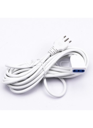 V-Tac cavo prolunga di colore bianco con spina e presa italiane. Il cavo, ha spina del tipo 2P+T 10 e presa del tipo 2P+T 10A, con fili di sezione 0,75mm². Carico massimo di 2300W - 250V. Lunghezza cavo 5 metri. SKU 8730.