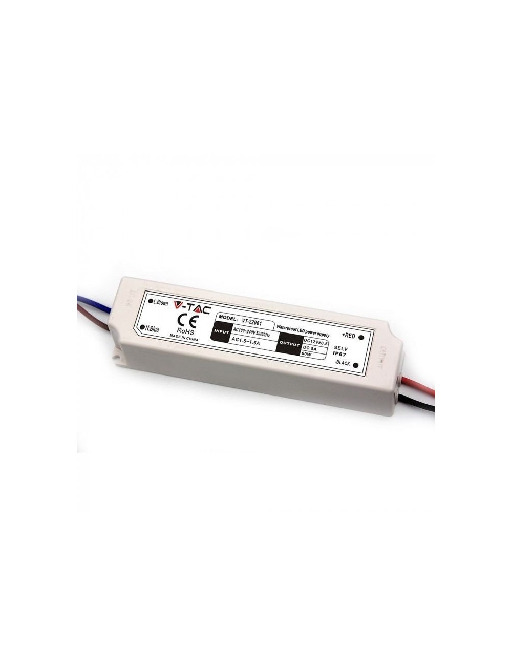 Restituzione entro 30 giorni dalla consegnaAlimentatore impermeabile V-Tac con grado di protezione IP67 per uso interno o esterno VT-22061 con corpo in materiale plastico. Potenza 60W. Input 100-240V AC 1.5~1.6 A 50/60Hz. Uscita 12V DC 5A. Alimentatore con protezione da sovraccarichi e cortocircuiti. Ai lati dell'alimentatore sono presenti fori per il fissaggio. Tramite l'uscita con cavi a saldare può essere connesso facilmente alle strisce LED o utilizzato per alimentare altri apparecchi elettronici come router, hub, telecamere di sicurezza, impianti audio-video, ecc. Dimensioni 166x43x33mm.
