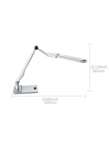 Lampada bicolore bianca e argento a Led di design con regolazione di intensita' e 3 regolazioni di luce, dalla luce fredda 6000K fino alla luce calda 3300K. Grazie ai tasti a sfioramento e' possibile accendere e regolare la lampada solo sfiorando i tasti. Grazie ai suoi 3 snodi e' possibile regolare la postura della lampada in base ad ogni esigenze. La lampada ha una potenza di 10W con equivalenza ad incandescenza di 60W e una luminosita' pari a 600 lumens. La lampada viene alimentata da un alimentatore incluso all'interno della confezione da 550 mA e 12V potenza massima 10W. Il cavo e' lungo circa 130 cm. Altezza massima 70 cm circa . Dimensioni della confezione: 46x20x8 mm.