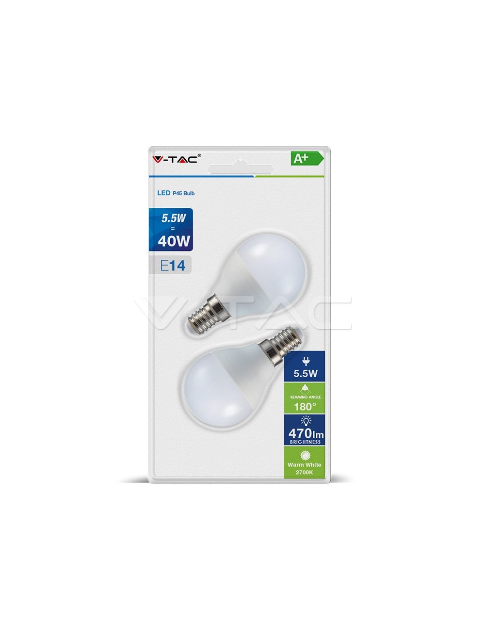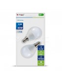 Confezione di 2 Lampadine LED V-Tac VT-2146 con potenza di 5.5W e attacco E14. Forma miniglobo P45. Flusso luminoso 470lm. 2 temperature di colore: Luce Calda 2700K SKU 7355 e Naturale 4000K SKU 7356.