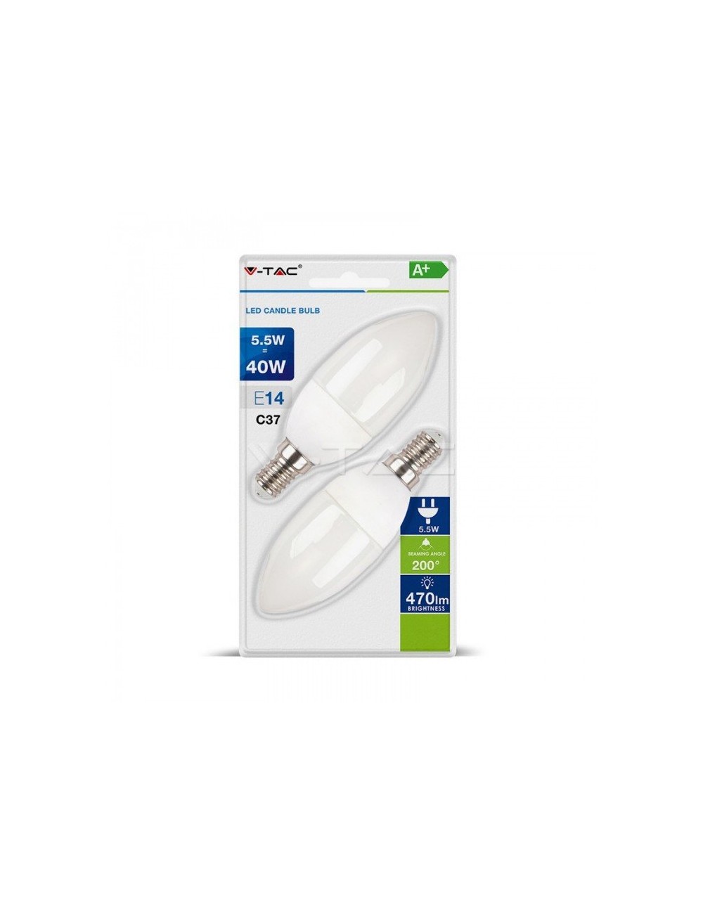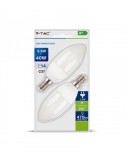 Confezione di 2 Lampadine LED V-Tac VT-2106 con potenza di 5.5W e attacco E14. Forma candela. Flusso luminoso 470lm. 3 temperature di colore: Luce Calda 2700K SKU 7291, Naturale 4000K SKU 7292 e Fredda 6400K SKU 7293.