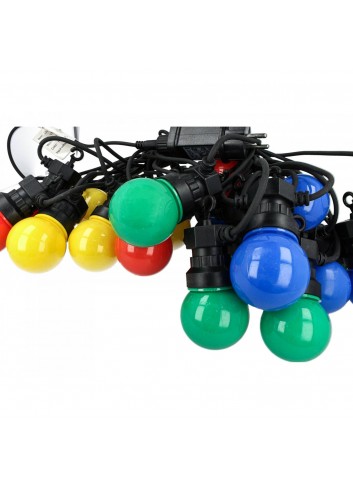 Restituzione entro 30 giorni dalla consegnaV-tac VT-71020 catena di 20 lampadine LED con trasformatore incorporato, una potenza di 10W (0,5W per lampadina) e un flusso luminoso di 600 lm. Questa catena è composta da 20 lampadine LED con forma mini globo. Le lampadine hanno la calotta con 4 colori diversi: rosso, verde, blu e giallo. Dotata di grado di protezione IP44, consente un'installazione sia all'interno che all'esterno. Grazie a questa catena, è possibile illuminare in modo sicuro e divertente, giardini, gazebi, e dare un tocco di originalità ai vostri party. Cavo di colore nero con lunghezza totale di 13 m. Catena di luci lunga 10 m con distanza tra le lampadine di 50 cm. Cavo di collegamento elettrico lungo 3 m. Alimentazione in ingresso: 220~240V. Tensione in uscita: 24V. Spina di tipo Schuko con trasformatore integrato. Questa catena è prolungabile grazie al connettore 2 pin situato all'estremità del cavo. SKU 7438.