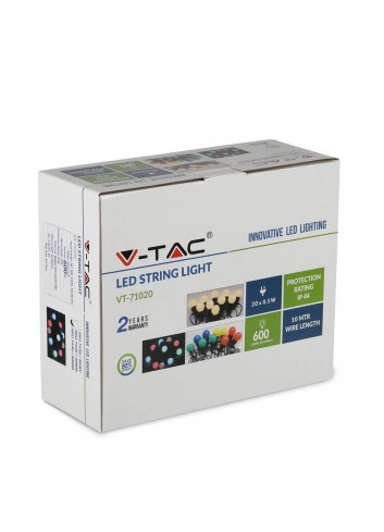 V-tac VT-71020 catena di 20 lampadine LED con trasformatore incorporato, una potenza di 10W (0,5W per lampadina) e un flusso luminoso di 600 lm. Questa catena è composta da 20 lampadine LED con forma mini globo. IP44. SKU 7438.