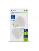Blister composto da 2 lampadine LED dimmerabili V-Tac VT-2108D con potenza di 6,5W e attacco GU10. Flusso luminoso450lm. 3 temperature di colore: Luce Calda 3000K SKU 7306, Naturale 4000K SKU 7307 e Fredda 6400K SKU 7308.