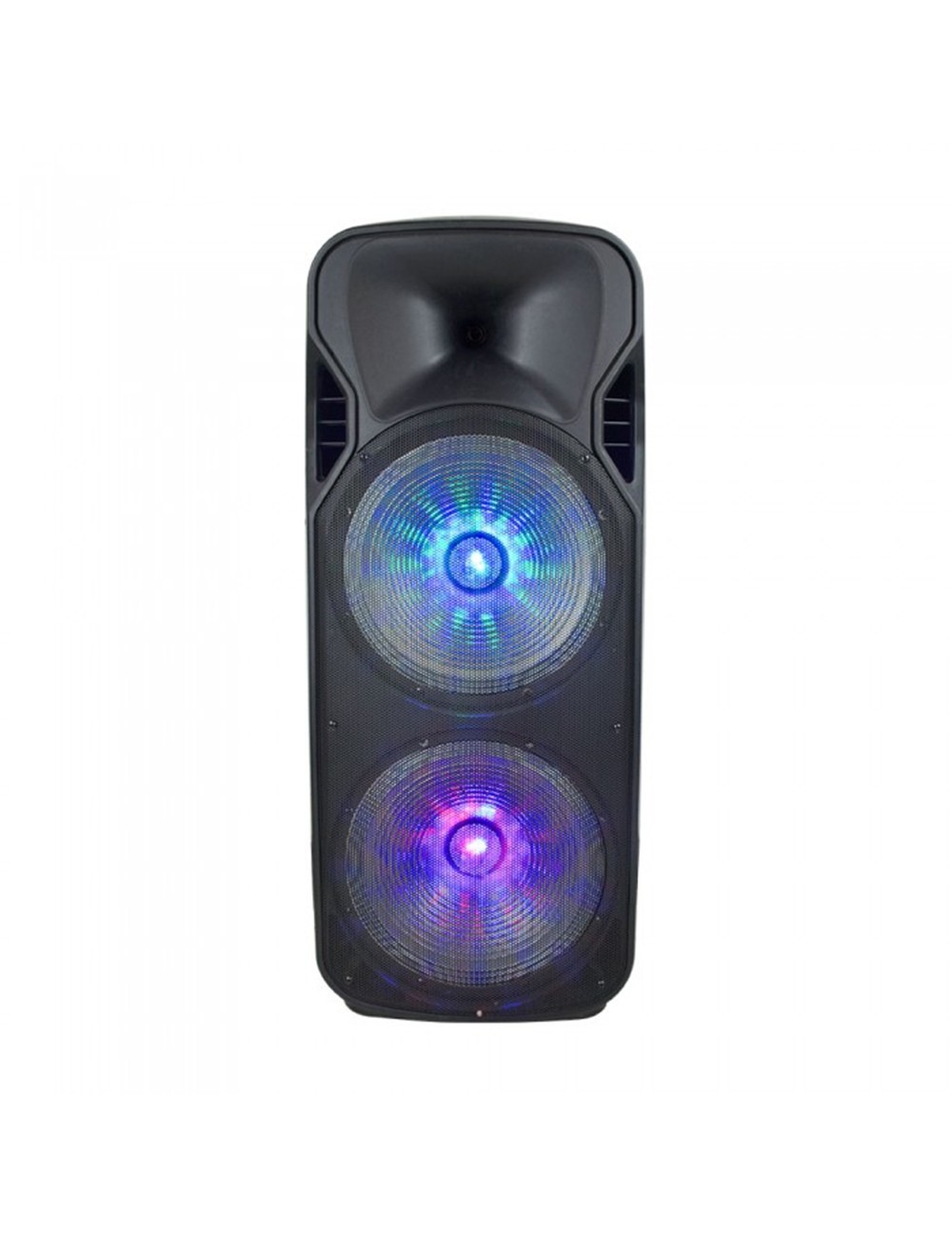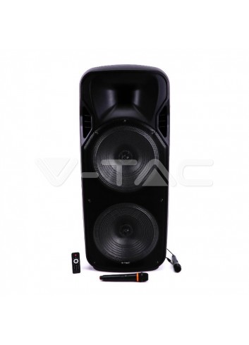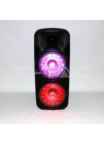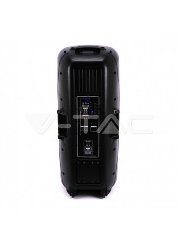 V-Tac Audio VT-6215-2 Wireless Speaker Karaoke Soundor 15x2. Griglia frontale metallica che fa trasparire i 2 woofer da 381 mm (15 pollici) ciascuno. Sulla parte superiore trovano spazio la pulsantiera con i comandi e gli ingressi audio (USB, AUX, MicroSD e 3 x Jack 6,3 mm utili per 2 microfoni e una chitarra). Speaker caratterizzato da un'illuminazione LED RGB diffusa all'interno dei 2 woofer. SKU 7733.