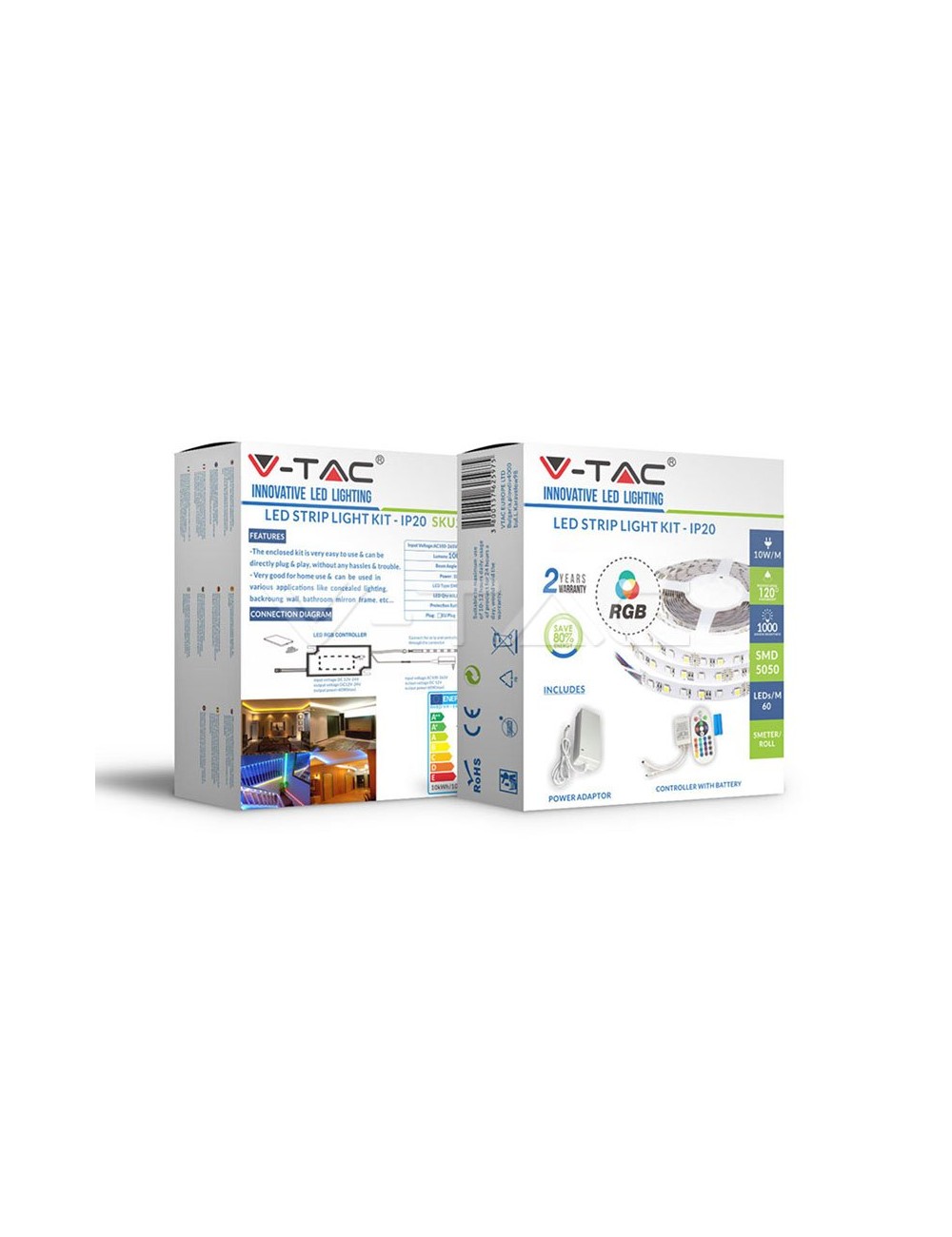 Kit completo pronto all'uso con striscia LED 5050 Multicolore RGB, Controller con telecomando 24 tasti e Alimentatore con spina a rete elettrica. È composta da 60 LED per metro. Flusso luminoso 1000lm a metro.