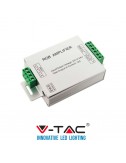 Amplificatore di segnale V-TAC VT-2407 SKU 3309 per strisce a LED RGB da 12/24V. Consente la gestione di strisce led più lunghe di 5 metri. Questo amplificatore ha un voltaggio di 12-24V, una tensione di uscita massima di 12A e si connette con la striscia LED tramite morsetti a vite.