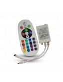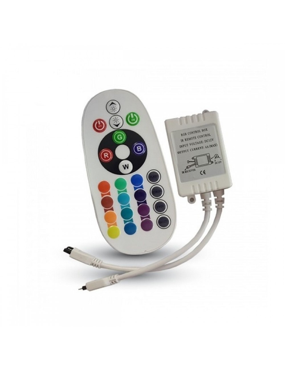 Controller per Strisce LED RGB V-Tac VT-2472 (SKU 3625) con telecomando ad infrarossi. Tramite il connettore 4 Pin RGB si collega facilmente alla striscia LED e grazie al Jack 2.1 può essere connesso all'alimentatore Plug&Play. Voltaggio 12-24V e tensione di uscita 2A per colore (6A max). Il controller è dotato di telecomando ad infrarossi con 24 tasti.