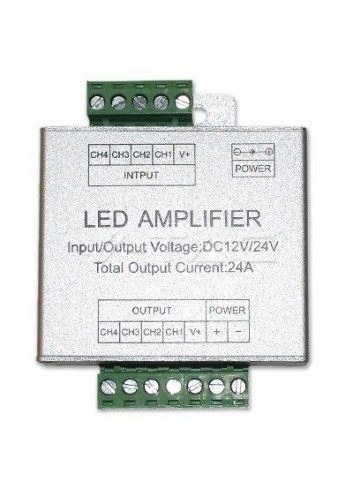 Restituzione entro 30 giorni dalla consegnaAmplificatore di segnale V-Tac VT-2408 (SKU 3327) per Strisce LED RGB+W. Prendendo ad esempio una striscia LED 5050 da 10W al metro, connessa ad un controller con tensione di uscita di 4A per canale ed alimentatore da 60W, le strisce a LED RGBW possono essere collegate in serie ad un controller RGBW per un massimo di 5 metri. Superati i 5 metri, per poter continuare ad utilizzare un solo controller, occorre inserire un amplificatore di segnale, con relativo alimentatore adeguato all'amperaggio della striscia. Inserendo un amplificatore ogni 5 metri di striscia LED, si può utilizzare 1 solo controller per comandare la striscia LED della lunghezza desiderata. Non tutte le strisce LED hanno un wattaggio di 10W al metro, quindi, la lunghezza effettiva della striscia che si può installare dipende dal wattaggio della striscia stessa. Questo amplificatore ha un Voltaggio di 12-24V, una tensione di uscita massima di 16A (4x 4A) e si connette con la striscia LED tramite morsetti a vite. Per poterlo utilizzare necessita di un alimentatore non incluso che può essere connesso all'amplificatore anche tramite Jack 2.1 Plug&Play.