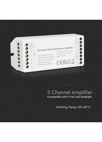 V-Tac VT-2435 SKU 2914 è un amplificatore a 5 canali che permette di far passare la corrente tra più strisce LED monocolore, RGB o RGB+W a 12V o 24V. Input: DC 12V / 24V. Output max: 15 A.