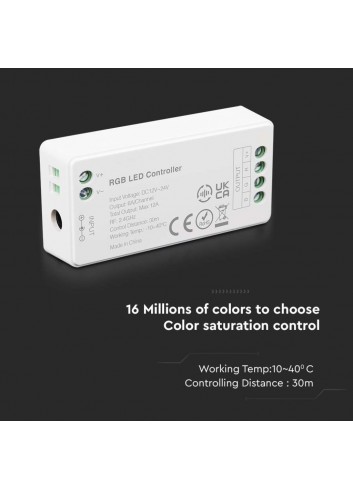 V-Tac VT-2434 SKU 2913 è un controller che permette di regolare l'intensità luminosa, la temperatura colore della luce bianca ed il colore delle strisce LED RGB+W a 12V o 24V. Input: DC 12V / 24V. Output max: 12 A. Connettore: 5 pin / morsetti a vite.