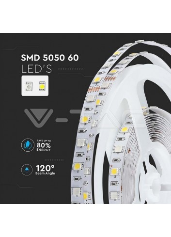 V-Tac VT-5050-60-RGBW-N è una striscia LED flessibile con potenza totale di 40W (8 W/m) e tecnologia LED SMD5050. Con fascio luminoso di 120° e flusso luminoso di 357 lm/m. 3 temperature di colore: RGB + Luce Calda 3000K SKU 212553, RGB + Luce Naturale 4000K SKU 212552 e RGB + Luce Fredda 6400K SKU 212159.